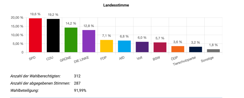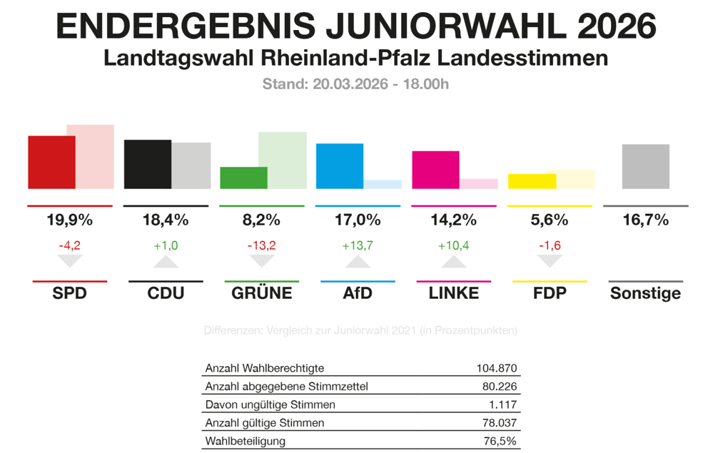 Bei der Juniorwahl am MvLG zu den Landtagswahlen (Grafik rechts) in Rheinland-Pfalz vom 22.03.2026 nahmen insgesamt 312 Wahlberechtigte teil. Von den 312 Wahlberechtigten haben 287 ihre Stimme abgegeben, sodass wir auf eine fulminante Wahlbeteiligung von 91,9%, kamen. Analysiert man das Wahlergebnis, fällt eine starke Zersplitterung des Parteiensystems auf, da auf der Basis des Ergebnisses des MvLG 8 Parteien im neuen rheinland-pfälzischen Landtag vertreten wären. Während neue Parteien wie Volt und BSW beachtliche Ergebnisse erzielen konnten, gibt es für die AfD nur moderate Werte. Offensichtlich sind die politischen Grundorientierungen unter der Schülerschaft des MvLG sehr breit gestreut.